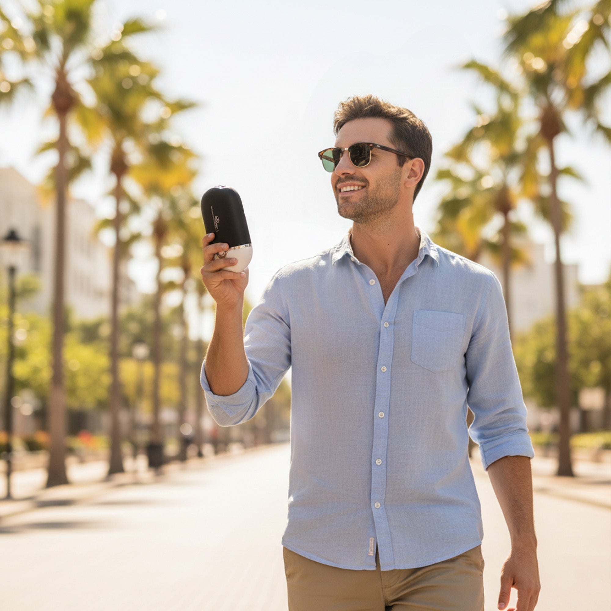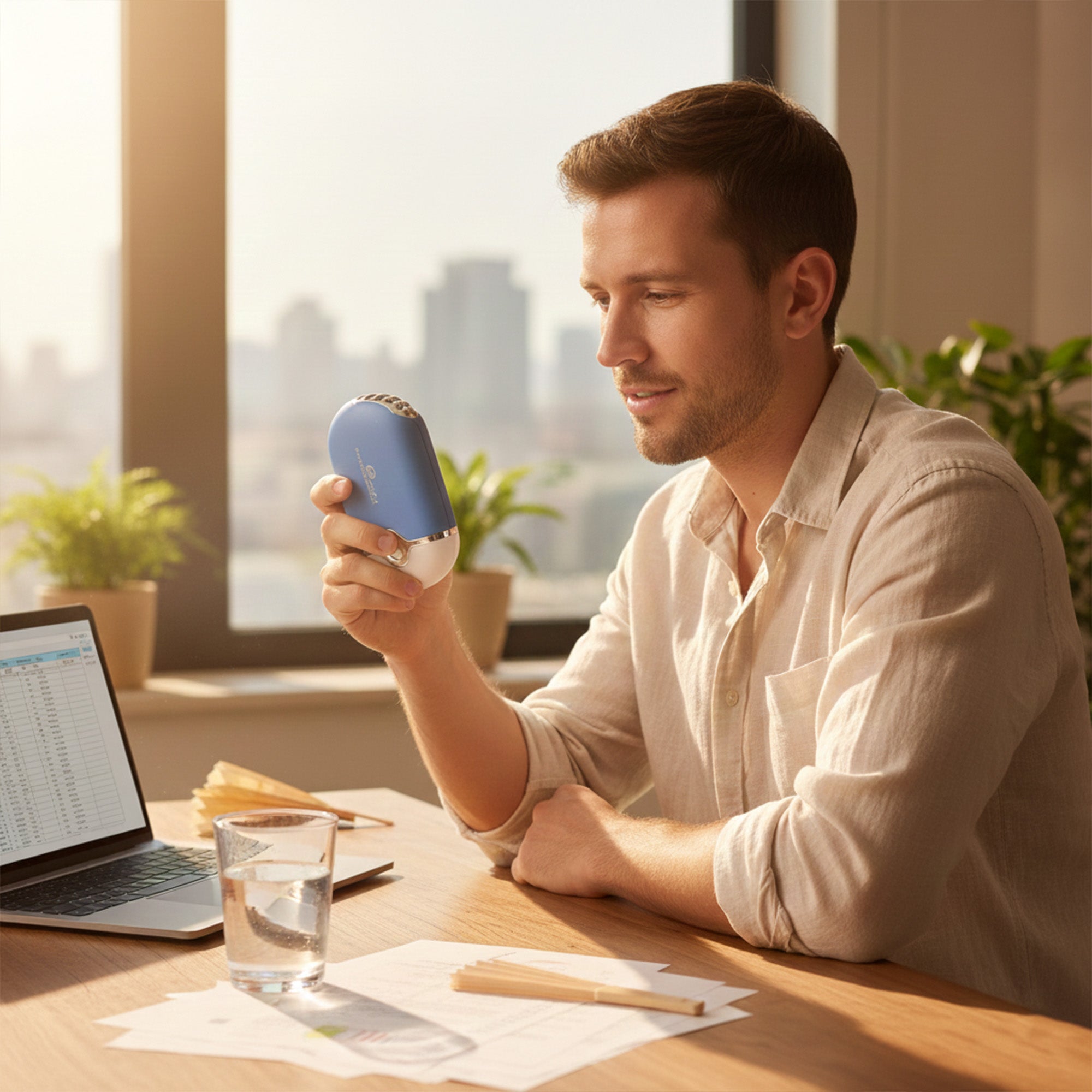 You can use it three different ways—standing on a desk, held in your hand, or worn around your neck using the included strap. With a built-in rechargeable battery and USB power option, it is a practical and reliable companion for summer days, travel, and everyday comfort.